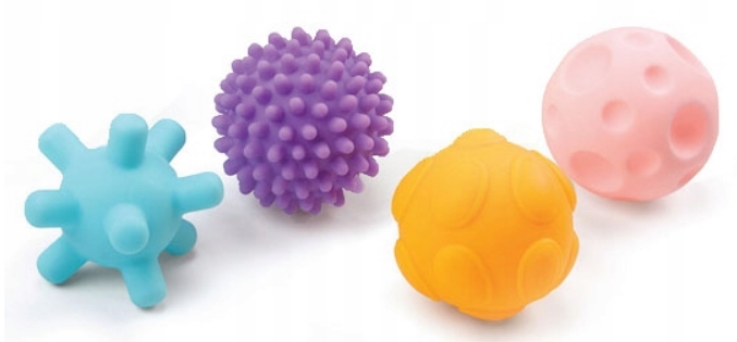 poznawanie: zmysły: maluch bada powierzchnię piłek sensorycznych paluszkami, odkrywając wytłoczone na nich wzory.