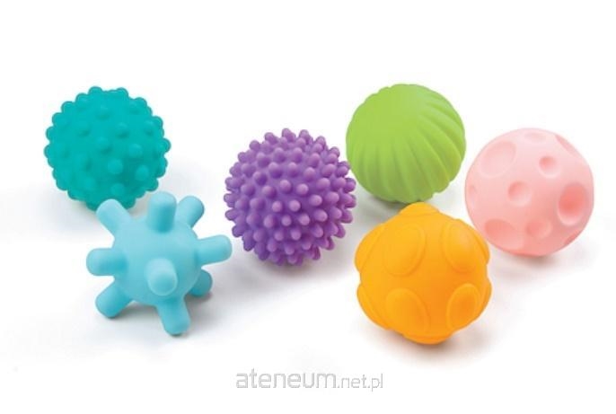 Poznawanie, zmysły: maluch bada powierzchnię piłek sensorycznych paluszkami, odkrywając wytłoczone na nich wzory; dwie piłeczki wydają przy zgnieceniu dźwięk,