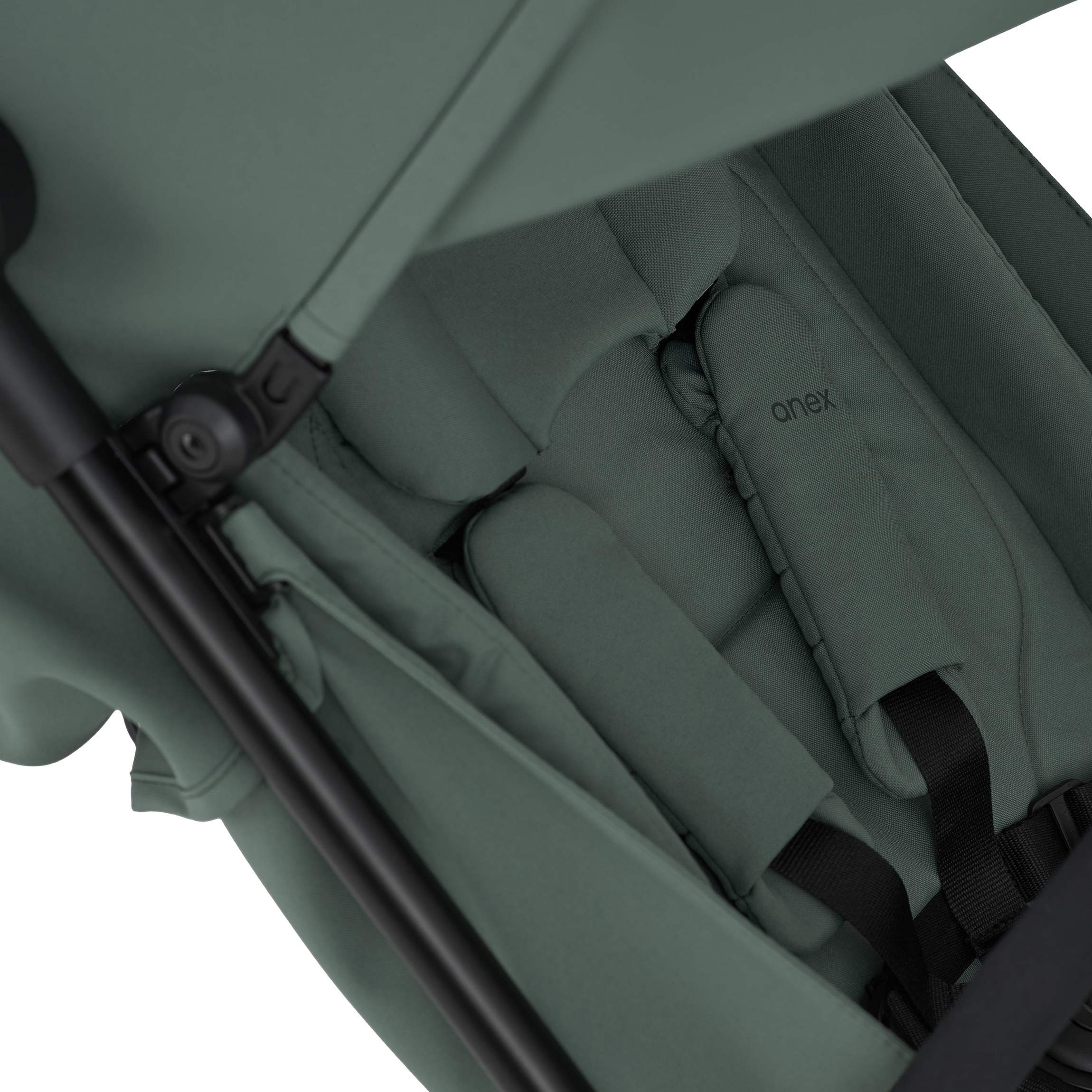Całe poszycie można w bardzo łatwy sposób ściągnąć i wyprać. Natomiast w samym materiale zastosowano filtr przeciwsłoneczny UPF50+ oraz dodatkowe zabezpieczenie hydrofobowe, które wchłania krople deszczu. Tylną część siedziska możemy swobodnie otworzyć, po to by poprawić wentylację.
