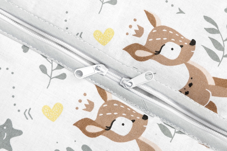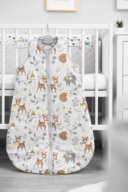 Wykonany jest z miękkiej bawełny wypełnionej otuliną. Nie zawiera twardych elementów, które mogłyby podrażnić skórę dziecka. Śpiworek wyposażony jest w dwustronny zamek błyskawiczny, zabezpieczony przy szyi, pozwalający na zmianę pieluchy bez wyciągania dziecka ze śpiworka. Pasuje do innych produktów naszej marki.