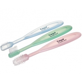 Opakowanie zawiera 3 rodzaje szczoteczek. Szczoteczka (1) do masażu dziąseł przeznaczona dla dzieci w wieku 0m+. Szczoteczka (2) do mycia pierwszych ząbków przeznaczona dla dzieci 11m+. Szczoteczka (3) do mycia zębów przeznaczona dla starszych dzieci.