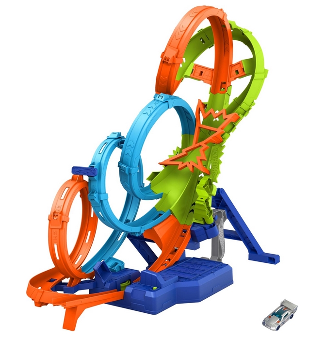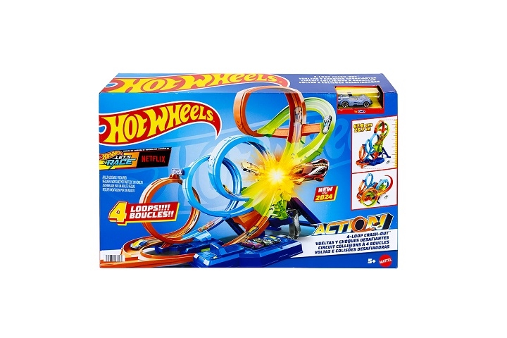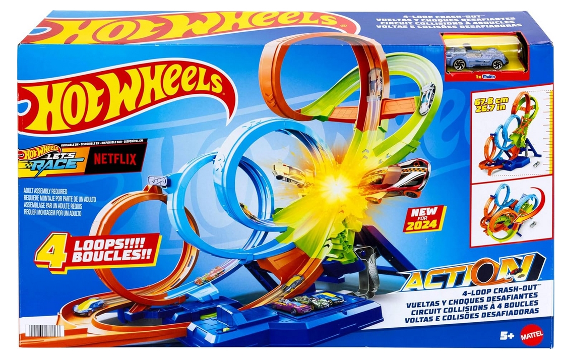 Zestaw Hot Wheels Action Poczwórna pętla kraks oferuje cztery dynamiczne pętle i ekscytujące strefy kolizji. Zbudowany z myślą o maksymalnej frajdzie, pozwala na spektakularne wyścigi z pełną prędkością i dramatycznymi kraksami. Przyspieszacz z napędem nakręca rajdową zabawę autami, a wyzwanie to ściganie się jak największą liczbą pojazdów, zanim nastąpi nieuchronna kraksa. Zestaw można złożyć, co ułatwia przechowywanie. Na przyspieszaczu jest też miejsce na 5 pojazdów w skali 1:64.
