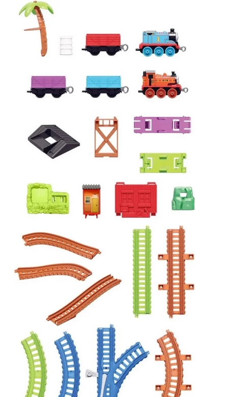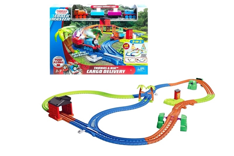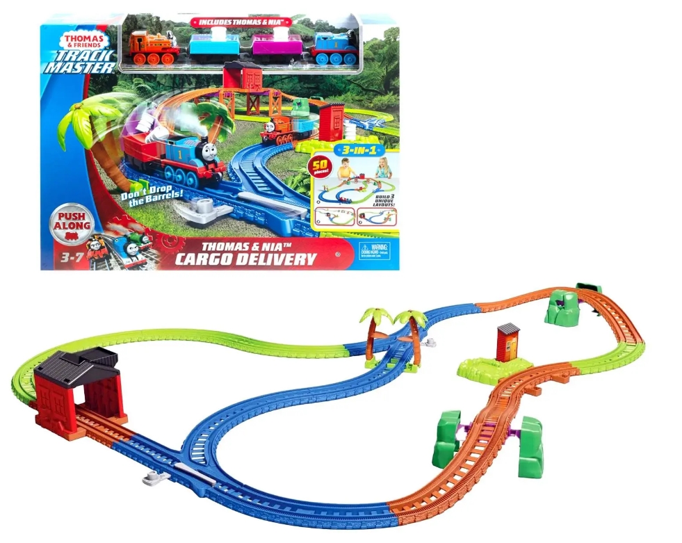 50-częściowy zestaw trackMaster zawiera silniki metalowe i Nia, pełny układ track, który można skonfigurować na trzech różnych sposobach, drzewka uchylne, upadek, pas przerzutek.