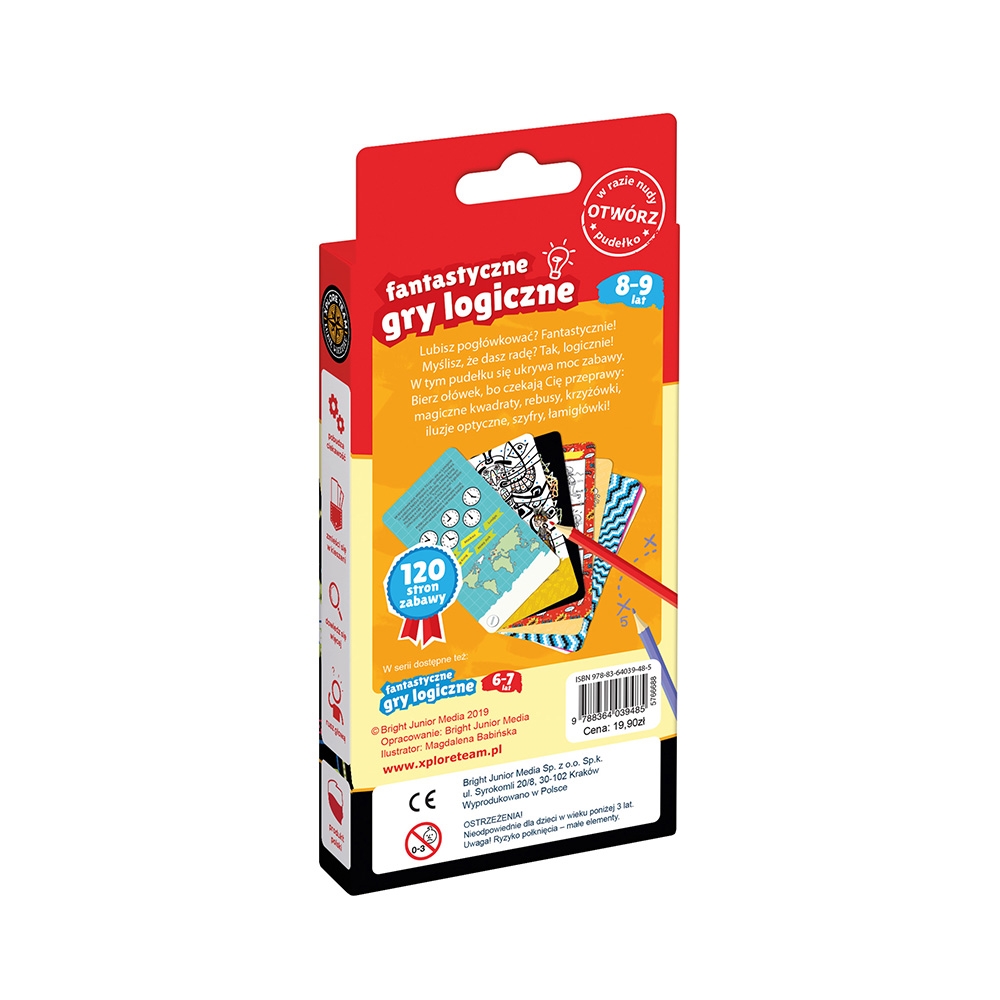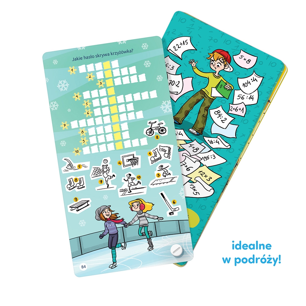 Sprawdźcie się! W książeczce znajdziecie przeróżne logiczne wyzwania: rebusy, kolorowanki, złudzenia optyczne, krzyżówki, labirynty, szyfry i łamigłówki. Rysujcie i główkujcie. Zaproście do zabawy przyjaciół i rodziców. To świetny sposób na zwalczenie nudy i poszerzanie wiedzy. Książeczkę zawsze możecie mieć przy sobie: mieści się w kieszeni!