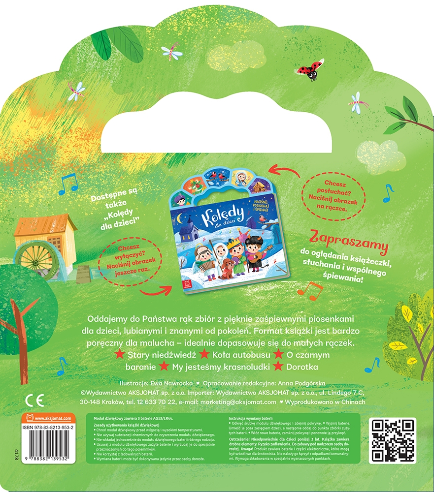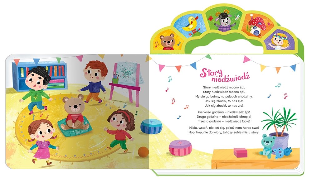Oddajemy do Państwa rąk zbiór z pięknie zaśpiewnymi piosenkami dla dzieci, lubianymi i znanymi od pokoleń. Format książki jest bardzo poręczny dla malucha - idealnie dopasowuje się do małych rączek. Kolorowe ilustracje oraz teksty każdej z piosenek zachęcą dziecko do wspólnego śpiewania. Teksty otoczone są kolorowymi ilustracjami, nawiązującymi do treści piosenek, często je uzupełniają, a co najważniejsze - zachęcają do wspólnej zabawy. Piosenkę można włączyć, naciskając obrazek na rączce - jeden obrazek odpowiada jednej piosence. W każdej chwili można wyłączyć grającą melodię, ponownie naciskając obrazek. Książka działa na baterie, które można wyjąć i wymienić. Istnieje również możliwość wyłączenia grających piosenek, przesuwając guzik przy baterii. Książka sprawdzi się dla dzieci w każdym wieku. Młodsze mogą tylko słuchać piosenek, starsze dzieci mogą przeczytać tekst i śpiewać równocześnie z nagraniem. W zbiorze znajduje się pięć popularnych piosenek wraz z nagraniami: Stary niedźwiedź, Koła autobusu, O czarnym baranie, My jesteśmy krasnoludki, Dorotka.