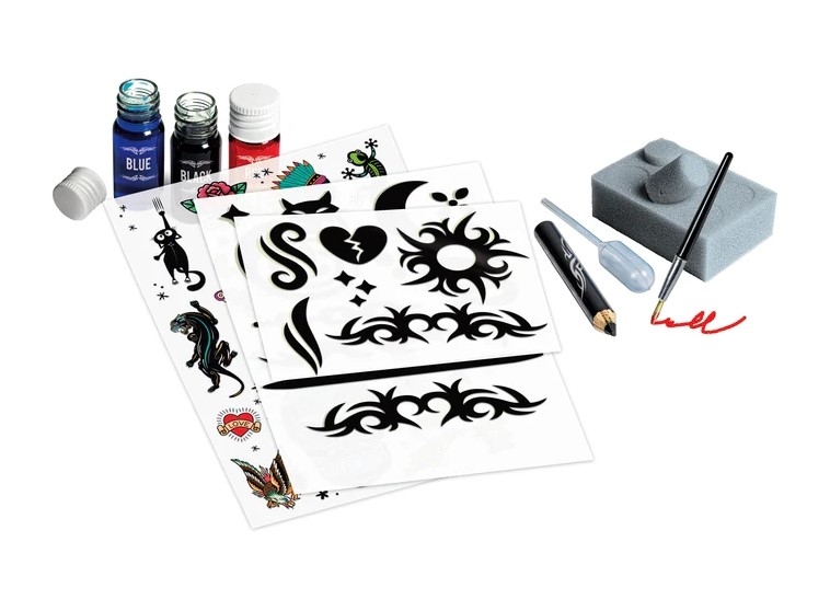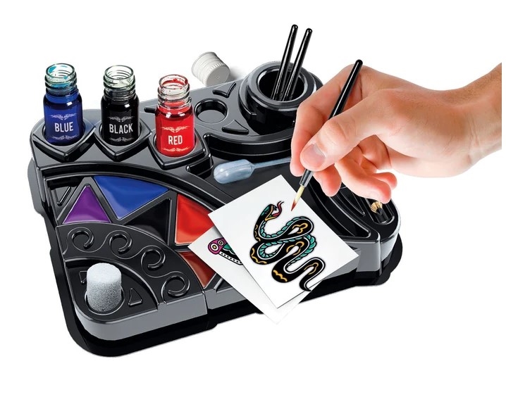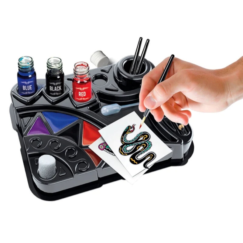 Laboratorium, ale równocześnie niesamowity zestaw ze wszystkimi elementami potrzebnymi do wykonania modnych tatuaży dla prawdziwych twardzieli. Zawiera blat roboczy, pędzle, płynne barwniki i szablony do ręcznego robienia tatuaży, jak prawdziwy tatuażysta.Instrukcja wyjaśnia krok po kroku, jak wykonać tatuaże, prowadząc dziecko przez kolejne etapy zabawnej i wciągającej zabawy. Wszystkie substancje i materiały zawarte w zestawie zostały przetestowane w celu zapewnienia maksymalnego bezpieczeństwa dla skóry. Zabawka rozwijająca kreatywność i sprawność manualną.