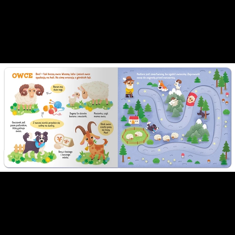 "Zwierzątka na wsi. Labirynty z ruchomymi elementami" to książeczka do pierwszych zabaw manualnych maluszka i wzbogacania jego wiedzy o otaczającym świecie. Z tą książką dziecko pozna najważniejsze zwierzątka z zagrody. Krótkie informacje na temat tego, co je charakteryzuje, podane zostały w łatwy do zrozumienia sposób.