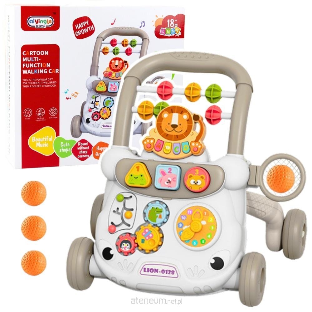 Kolorowy design z wizerunkami zwierząt takich jak lew, królik i inne przyciąga uwagę najmłodszych i zachęca do aktywności. Solidna konstrukcja gwarantuje bezpieczeństwo użytkowania, a szeroka podstawa i cztery wytrzymałe koła zwiększają stabilność. Dodatkowo chodzik został wyposażony w specjalny uchwyt, który maluch może chwycić, wspierając się podczas nauki chodzenia. Dzięki wbudowanym funkcjom dźwiękowym i mechanicznym zabawkom rozwija się nie tylko koordynacja ruchowa dziecka, ale także jego zdolności poznawcze oraz zmysły słuchu i dotyku.