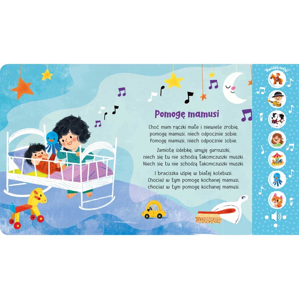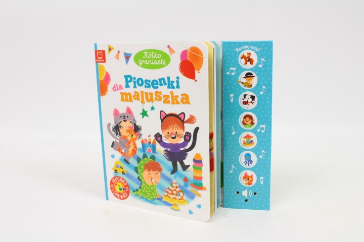 "Kółko graniaste" to interaktywna książeczka dźwiękowa z serii "Piosenki dla maluszka", która wprowadza najmłodszych w świat tradycyjnych polskich piosenek. Każda strona to kolorowa ilustracja z tekstem piosenki, a na panelu bocznym znajdują się przyciski, które po naciśnięciu odtwarzają melodię. Idealna do wspólnego śpiewania i nauki przez zabawę.