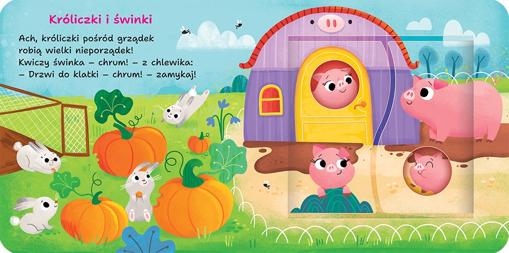 Z książeczką "Na wsi" maluszki poznają: króliki i świnki, krowy i konie, kury i indyki, owce i kozy oraz gęsi i kaczki.