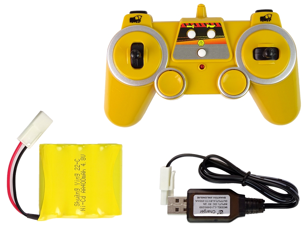Do zestawu dołączono pilot 2.4G, który w dużym stopniu podnosi poziom zabawy. Z jego pomocą operator betoniarki może kierować nią, zmieniając kierunki jazdy na przód/tył i prawo/lewo, a także obracać gruszką do mieszania betonu.