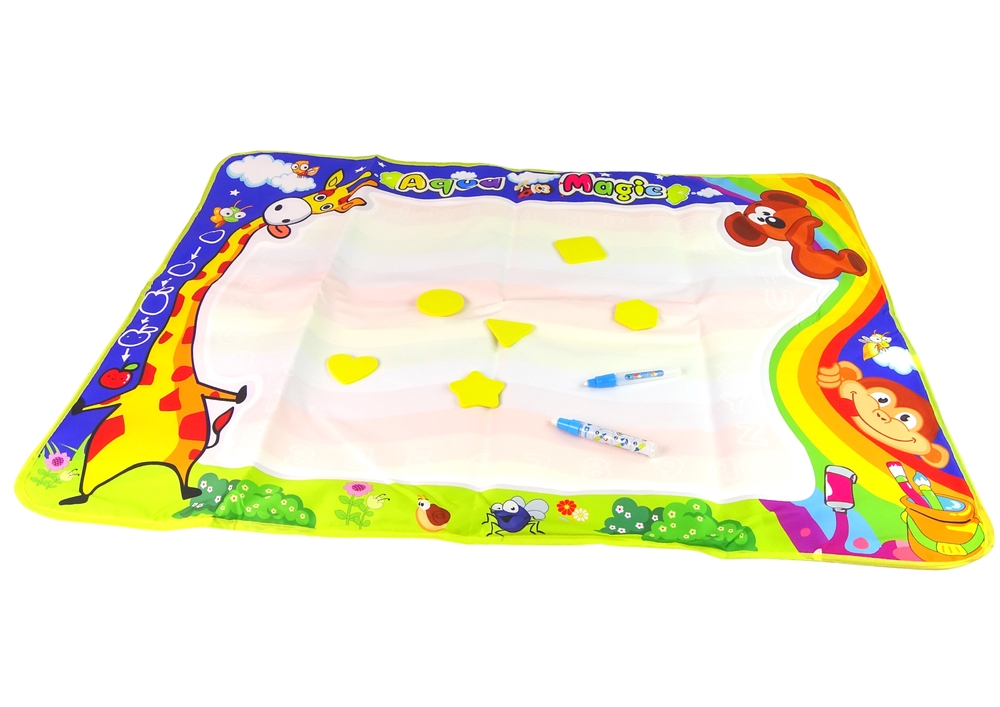 Do zestawu dołączono dwa pisaki wodne dzięki czemu unikniemy kłótni między rodzeństwem kto ma malować pisakiem a wykorzystując drugi pisak przez rodzica wspaniale spędzimy czas z dzieckiem. Mata wykonana jest z przyjemnej w dotyku tkaniny, którą z łatwością można składać i utrzymać w czystości. W odróżnieniu od kartek papieru mata jest wielokrotnego użytku.