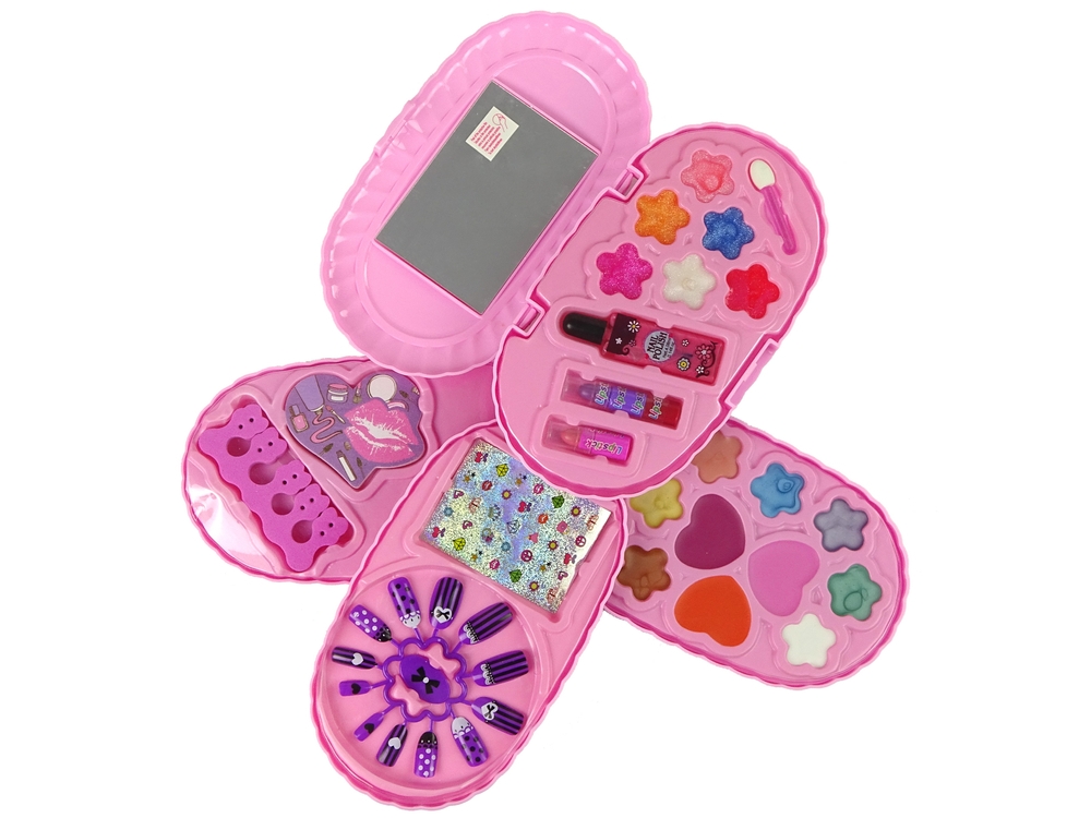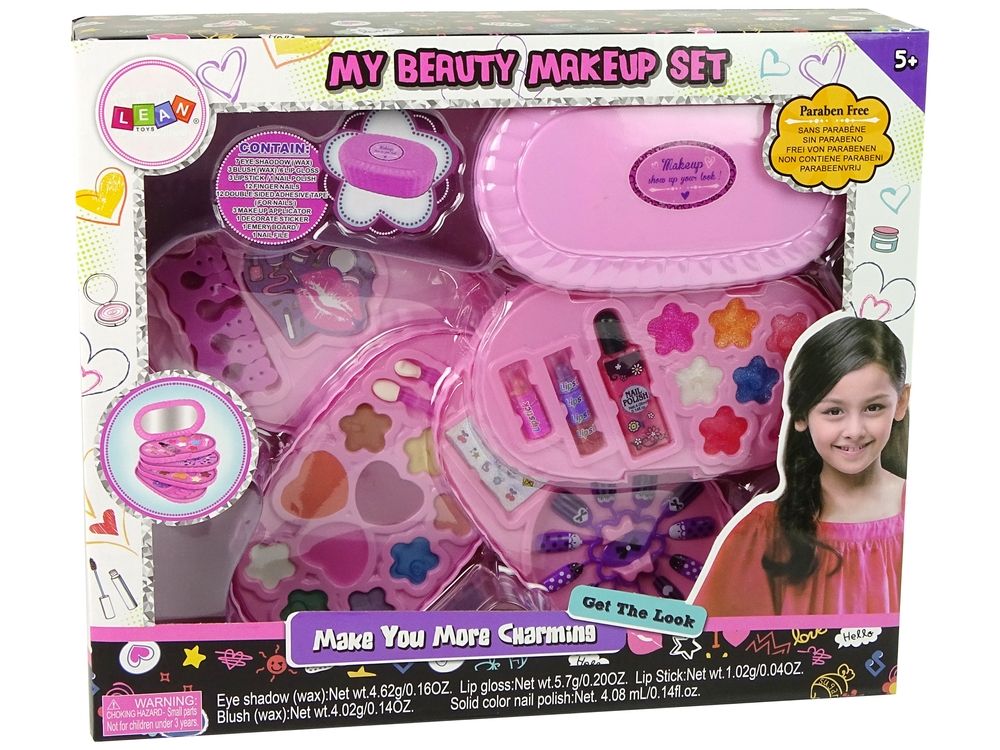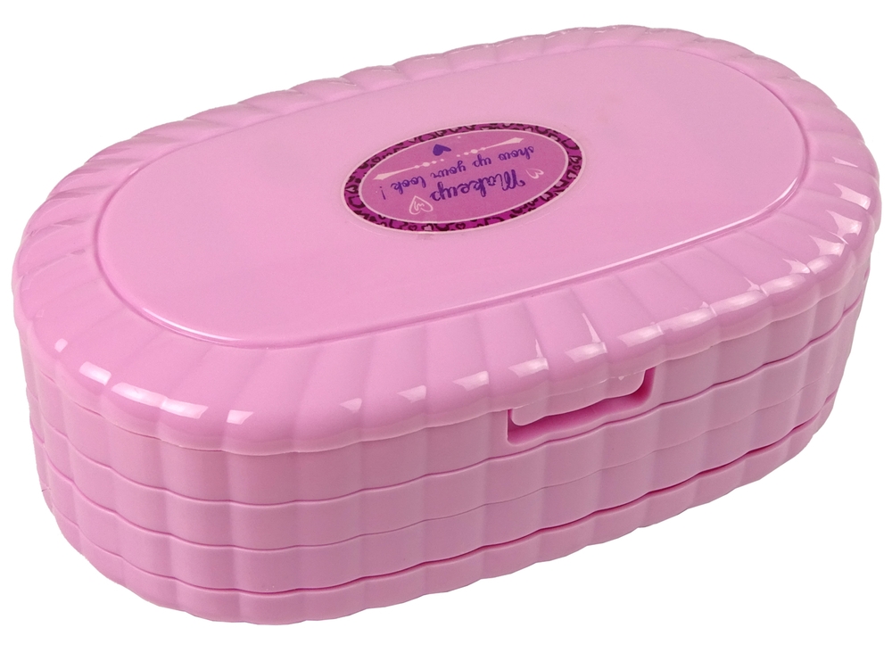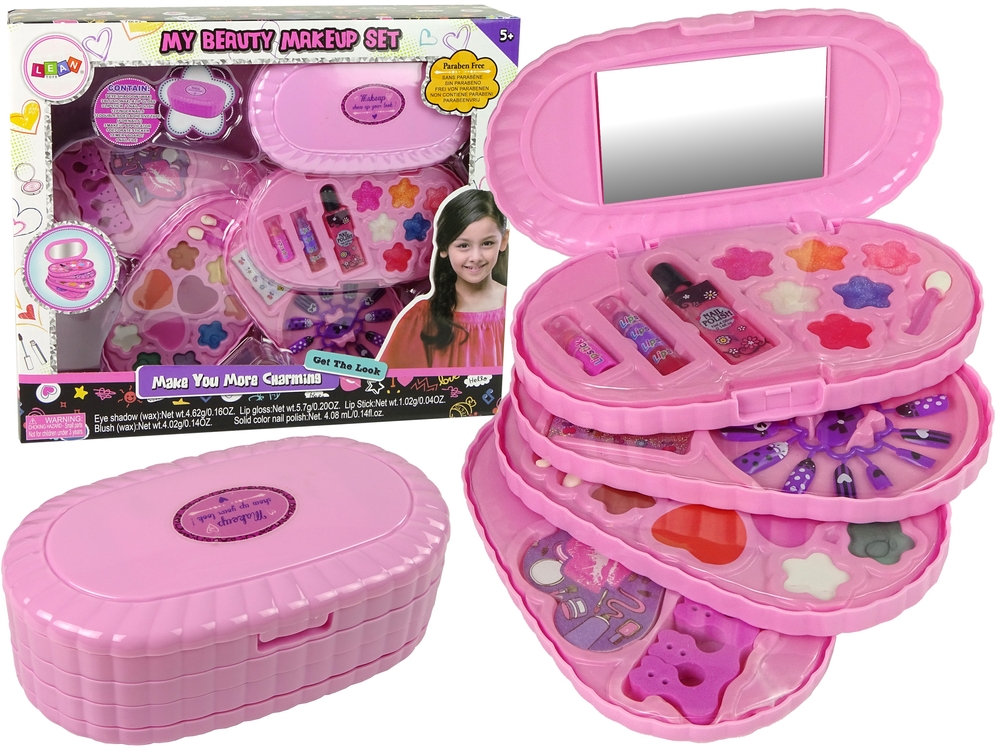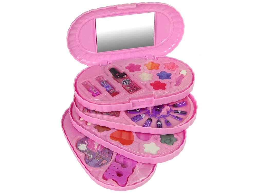 Cały zestaw mieści się w podłużnej kosmetyczce, która składa się z czterech szufladek. Każda z nich chowa w sobie coś wyjątkowego. Jedna warstwa kryje w sobie pilnik do paznokci w kształcie serca oraz separator. Kolejna róże oraz cienie do powiek. Na trzeciej paletce znajdują się tipsy i naklejki. Ostatnia z nich posiada błyszczyki, lakier do paznokci i szminki. Mała księżniczka może zrobić sobie dzień piękności, nawet wraz z koleżankami. A co najlepszy może mieć ją zawsze przy sobie. Może schować ją w torebce i użyć, wtedy kiedy tylko potrzebuje.