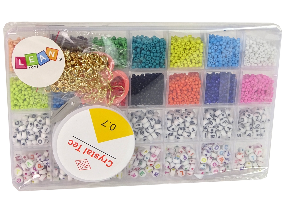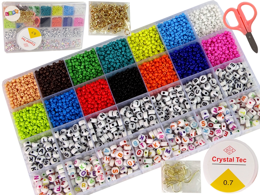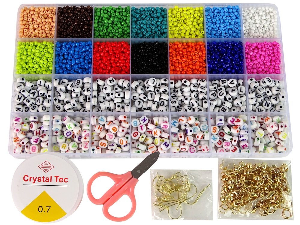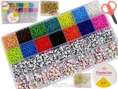 Zestaw zawiera wszystko, co potrzeba do stworzenia biżuterii. Duży organizer zawiera, aż 14 rodzai kolorów koralików oraz liter, z których można ułożyć różne słowa np. stworzyć naszyjnik ze swoim imieniem lub koleżanki. Każdy znajdzie swoje ulubione!