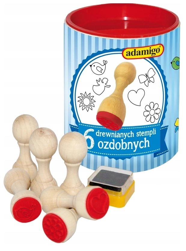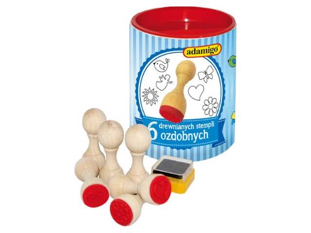 Zestaw 6 drewnianych stempelków do ozdabiania papeterii, dekorowania prezentów, tworzenia swoich kompozycji, kolorowania. W pudełku, oprócz stempli znajduje się poduszka z tuszem. Kreatywna zabawa dla najmłodszych!