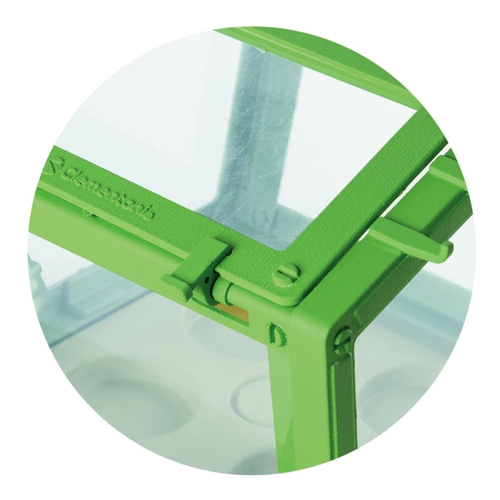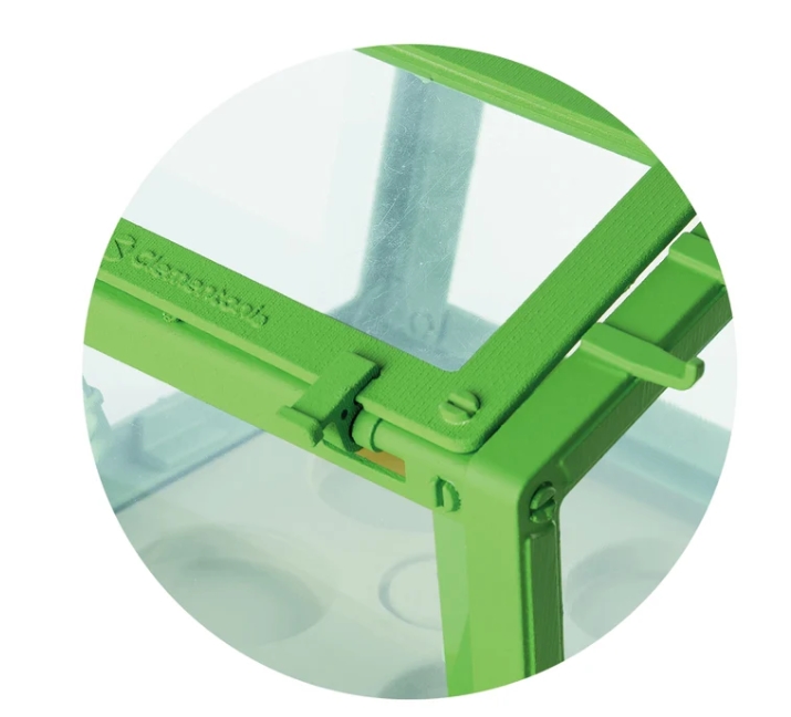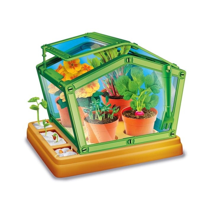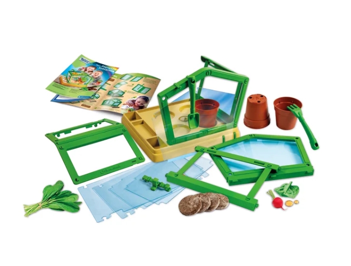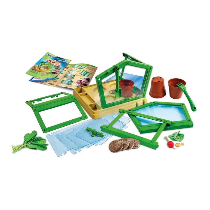Zestaw zawiera przezroczystą szklarnię z regulowanym dachem, nasiona, torf i narzędzie ogrodnicze, dzięki czemu można od razu rozpocząć zabawę.